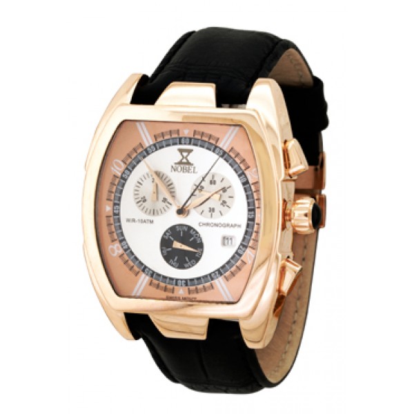 A magnificent chronograph timepiece made of solid stainless steel & Rose Gold 2 microns plating. This very striking watch contains a Swiss ISA Chronograph movement, a rose-gold dial with 3 sub-dials. It contains a scratch resistant sapphire crystal, and a genuine black leather strap with a self adjusting S/S rose gold plated buckle. This beautiful timepiece is water-resistant 10ATM.