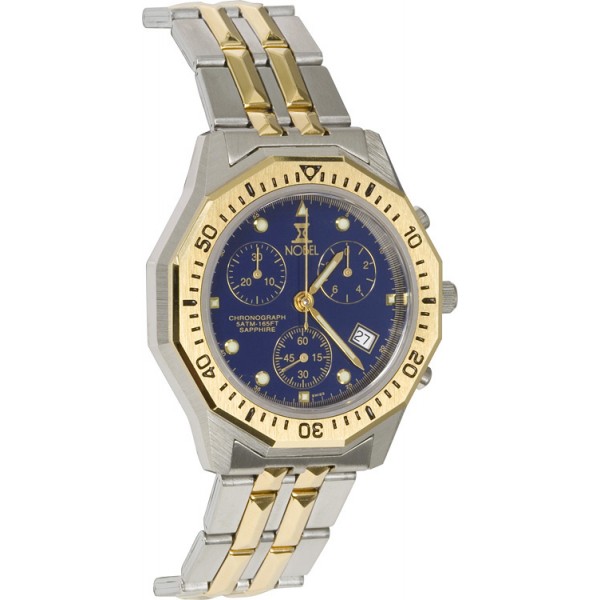 Nobel all solid stainless steel chronograph timepiece, accented with 22 karat gold 10 micron plating. This very attractive bi-color timepiece contains a very striking blue dial with 12 luminous hour markers, 3 luminous hands and 3 gold chrono-hands. This chronograph watch contains a Swiss made movement, and is fitted with an anti-reflective scratch resistant sapphire crystal. It is water-resistant to 3 ATM