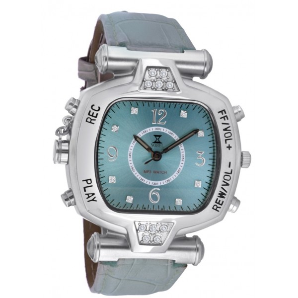 A very striking solid stainless analog MP3 recording watch. This magnificent timepiece has an aqua-green dial and a matching genuine leather bracelet, 4 applied Arab numerals, 8 set crystals at each hour-mark, and 10 set cz stones on the watch bezel for added beauty. This MP3 Watch has built in 4GB flash memory, a built in rechargeable battery w/7 hours of continuous playing time, 5 hours of continuous recording time, Built in microphone, Shockproof without sound jumping. Operating Platform: Window 98/Me/NT/XP or above. Available in Black, Lavender, Pink and White .
